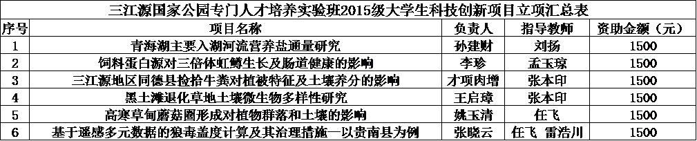 为进一步激励并培养三江源国家公园专门人才培养实验班大学生参与科研的积极性及实践创新能力,经研究,8040威尼斯特设立三江源国家公园专门人才培养实验班2015级大学生科技创新项目。